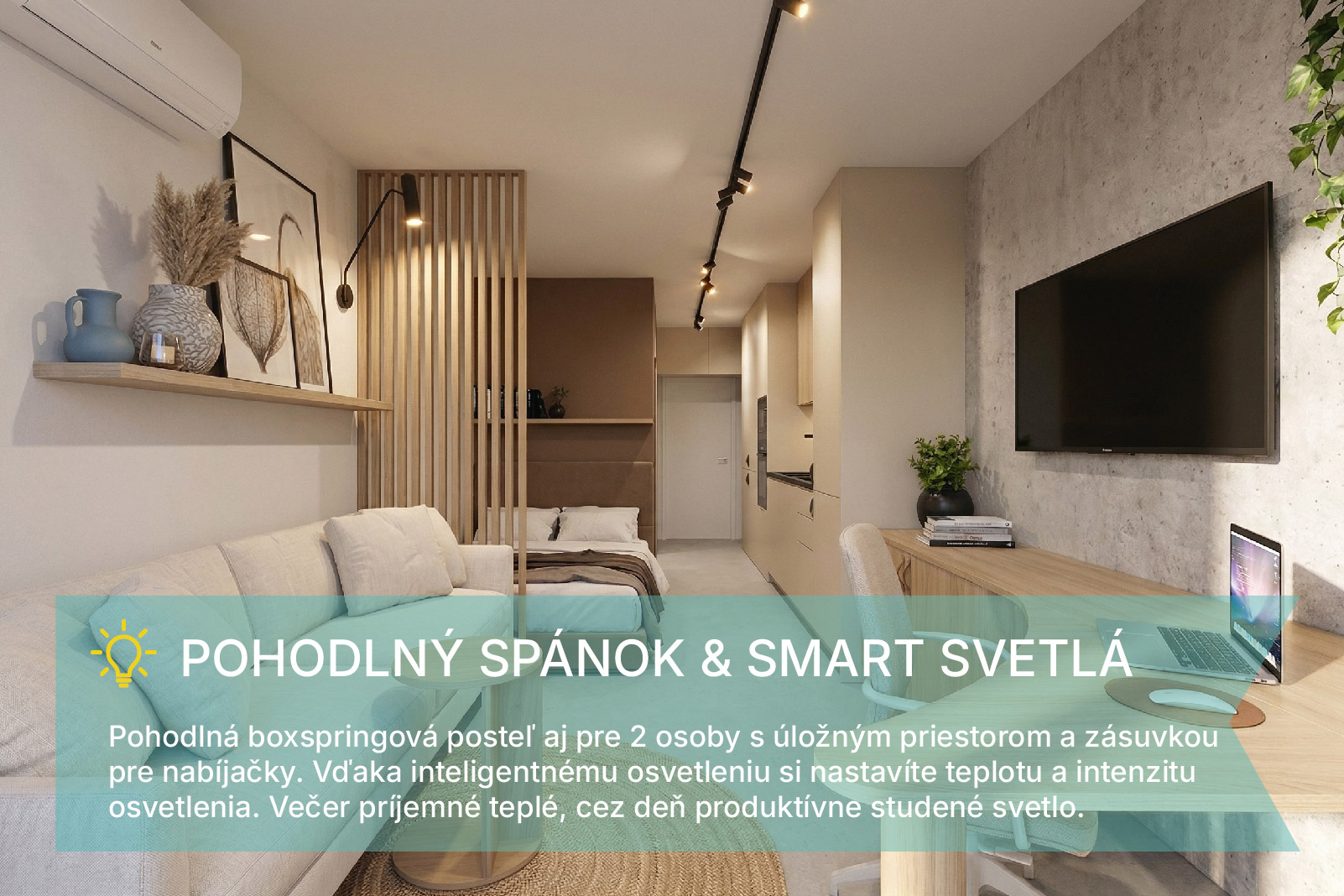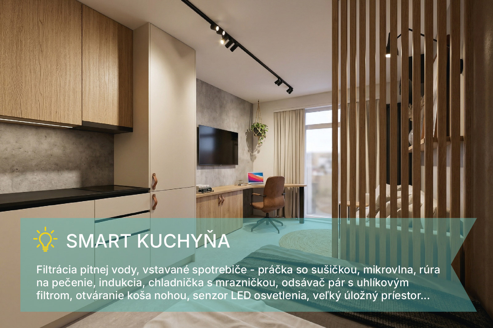 Unikátne SMART Studio na Kysuckej ulici v Košiciach, ktoré posúva bývanie na úplne inú úroveň. Na ploche 20,5 m² + priestranná lodžia je premyslený doslova každý centimeter – výsledkom je priestor, ktorý pôsobí vzdušne, funkčne a technologicky nadčasovo.