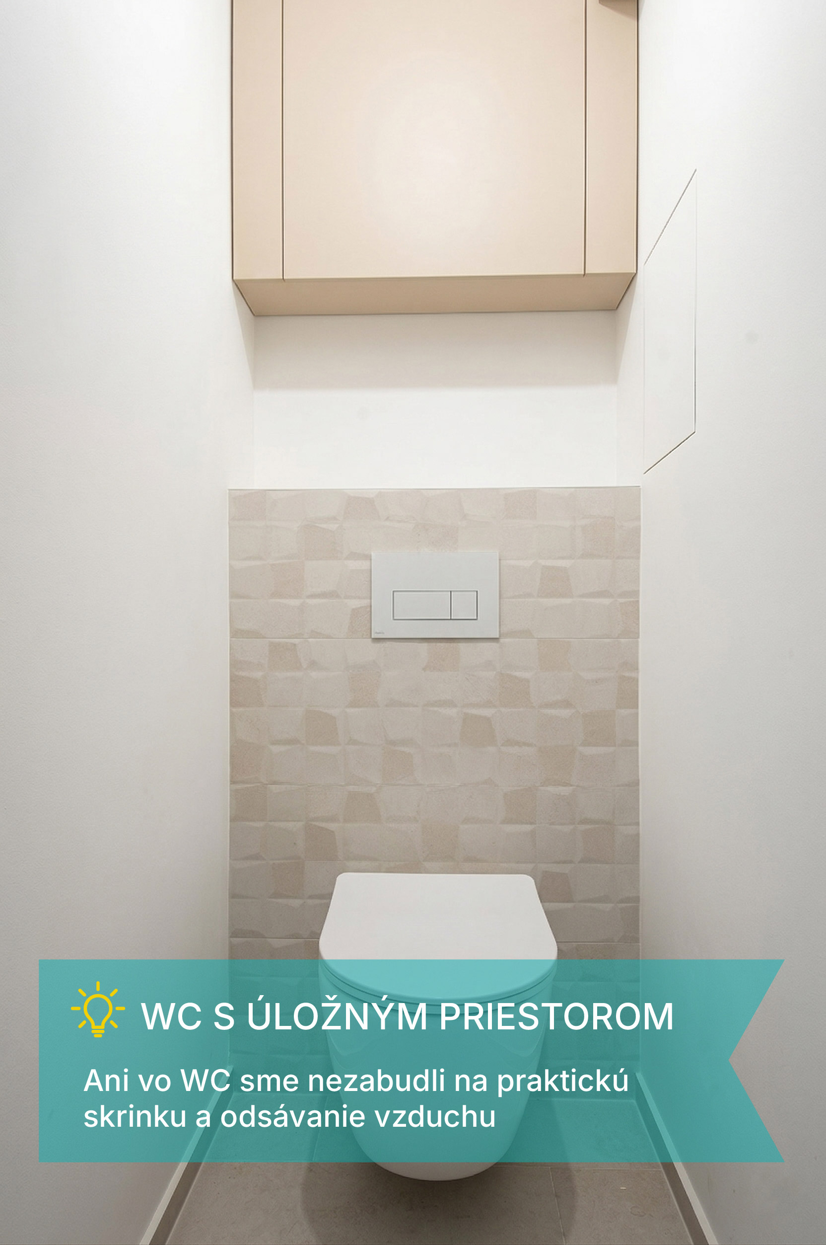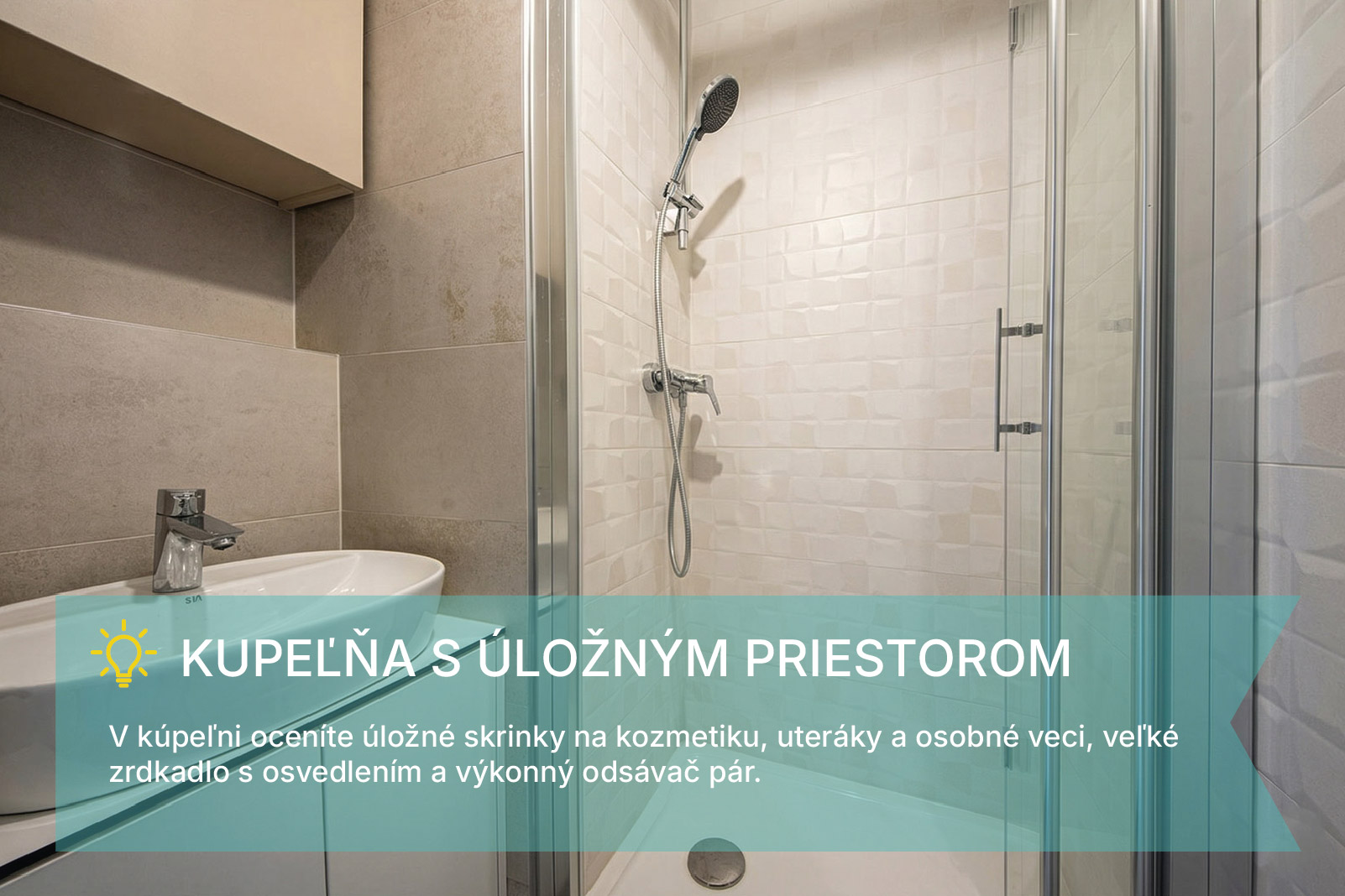 V kúpeľni a WC nájdete praktické úložné skrinky, veľké zrkadlo s osvetlením, výkonné odvetrávanie a praktické riešenia, ktoré v malých bytoch zvyčajne chýbajú.